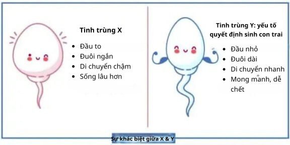 Người mẹ có nhiễm sắc thể giới tính là XX và người cha sẽ có nhiễm sắc thể giới tính là XY. Điều này có nghĩa là trong tinh dịch của người cha sẽ có hai loại tinh trùng: tinh trùng có cặp nhiễm sắc thể giới tính X xác định là con gái và nhiễm sắc thể Y xác định là con trai. Tế bào trứng của người mẹ có một nhiễm sắc thể giới tính duy nhất là nhiễm sắc thể X. Tại thời điểm tế bào sinh sản được tạo ra, số lượng nhiễm sắc thể giảm xuống còn 23 tế bào sinh sản của cha và mẹ được kết hợp với nhau khi thụ tinh. Vì vậy, em bé là tổng di truyền của cha và mẹ là một nửa. Tỷ lệ tinh trùng có nhiễm sắc thể X so với tinh trùng có nhiễm sắc thể Y là khoảng 50% trên 50%. Vì vậy, trong tự nhiên, cơ hội có con trai hoặc con gái là khoảng 50%. Nếu tinh trùng của người cha là X vào quả trứng thì bạn sẽ có con gái, nhưng nếu tinh trùng Y vào quả trứng thì bạn sẽ có con trai.