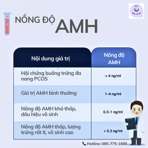 - Hormone AMH nằm trong khoảng 1 – 4 ng/ml là giá trị hormone bình thường.